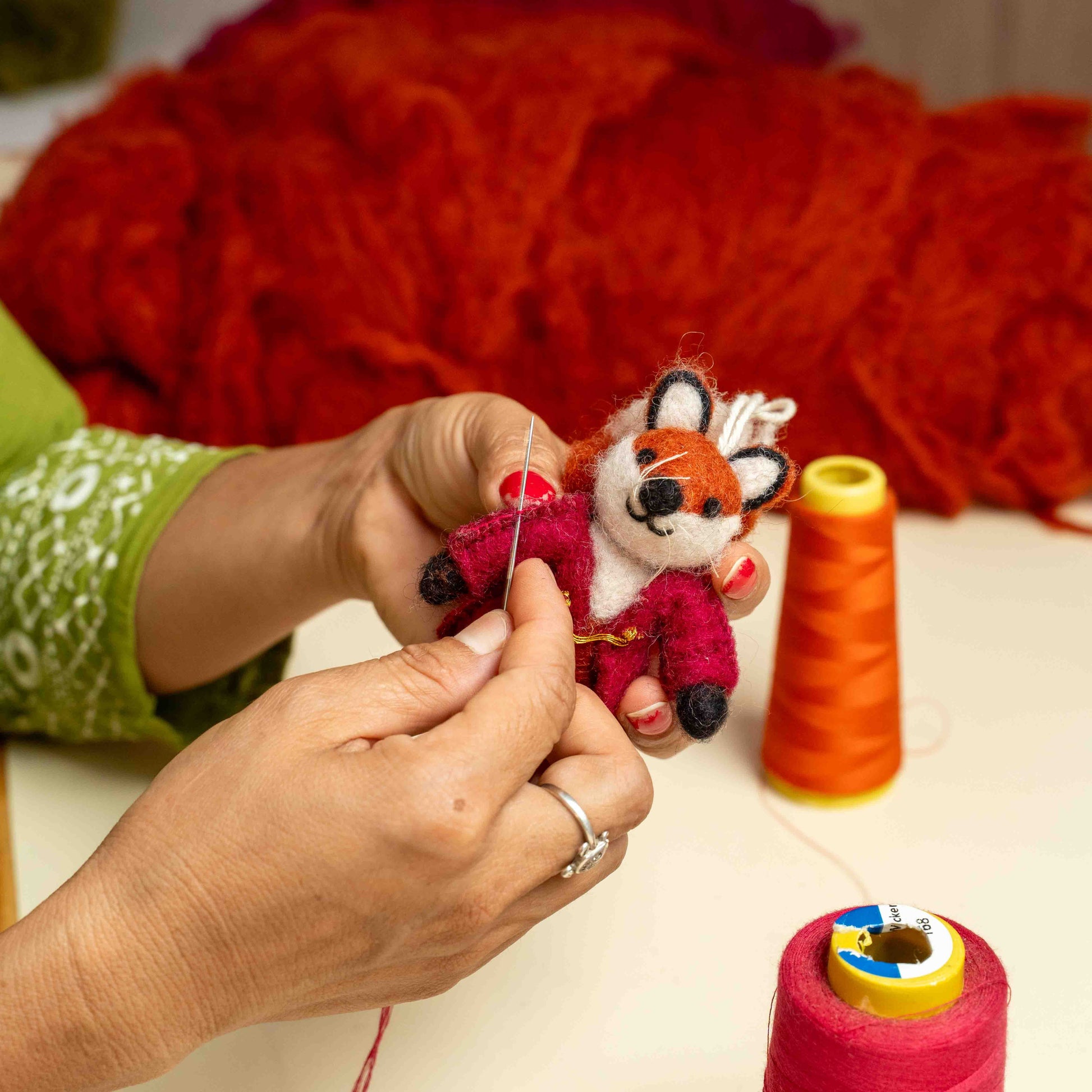 Filzfuchs mit tief burgunderrotem Fell und buschigem Schwanz. Ein bezaubernder Anhänger, der Ihrer Herbstdekoration sofort Wärme verleiht.