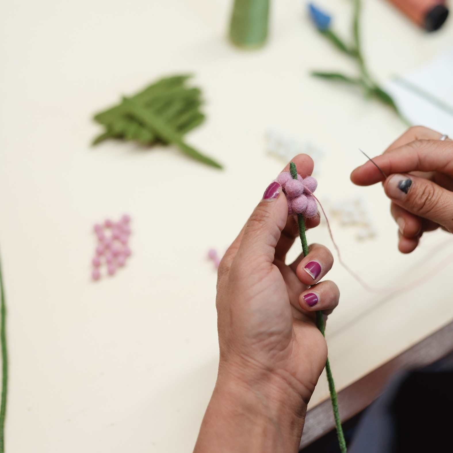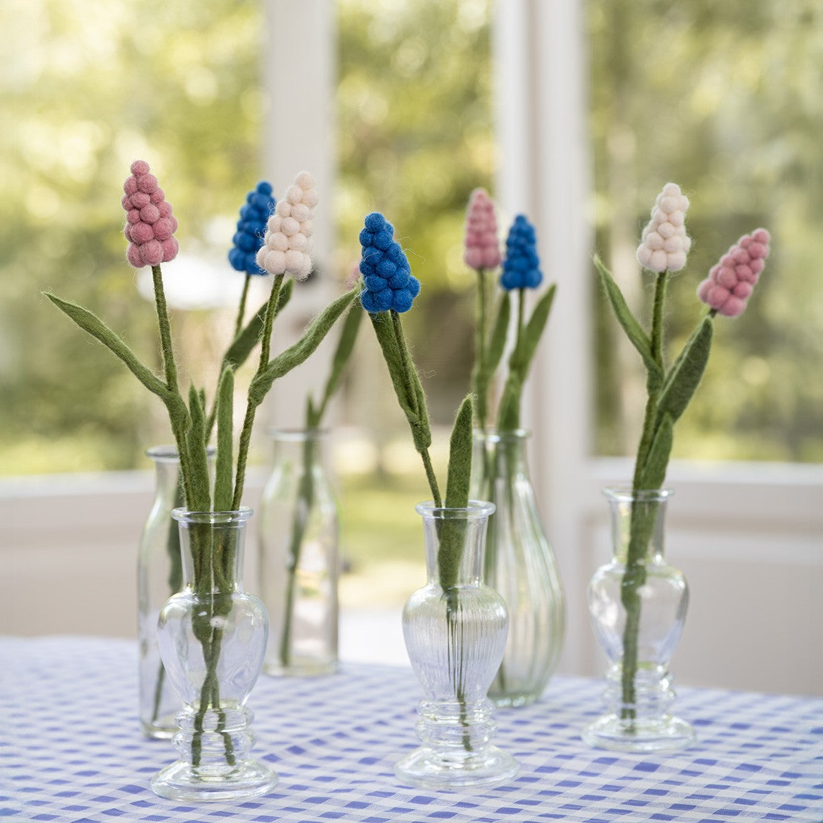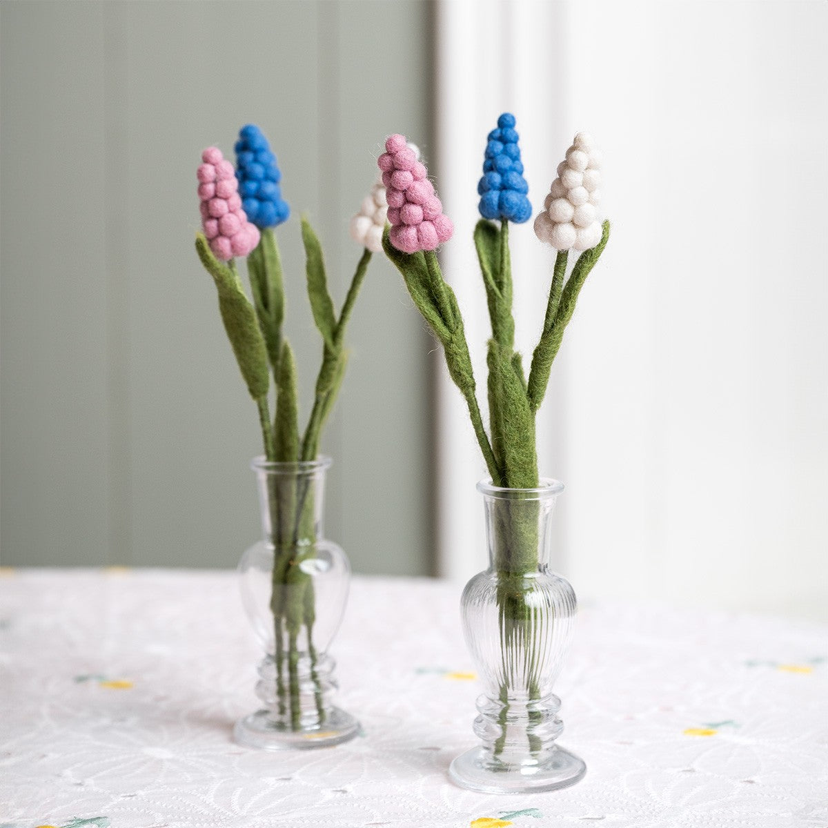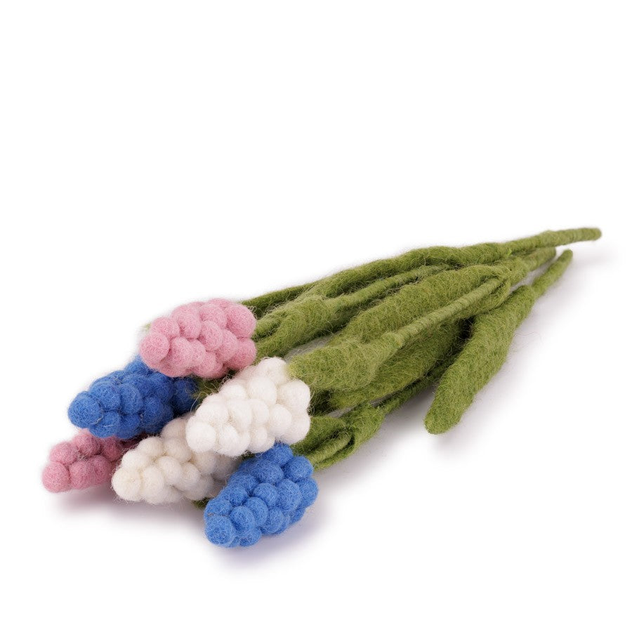 2 Blauwe, 2 Witte en 2 Roze Druifjes van het delicate merino-wolvilt. In de stengel is metaaldraad verwerkt zodat de bloem in vorm gebogen kan worden indien gewenst. Erg leuk in een vaasje.